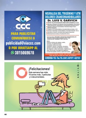 PARA PUBLICITAR COMUNÍQUESE A publicidad@viaccc.com O POR WHATSAPP AL 3815069678 ¡Felicitaciones! Esta semana has visto 10 series más, 3 películas y 4 documentales. 46